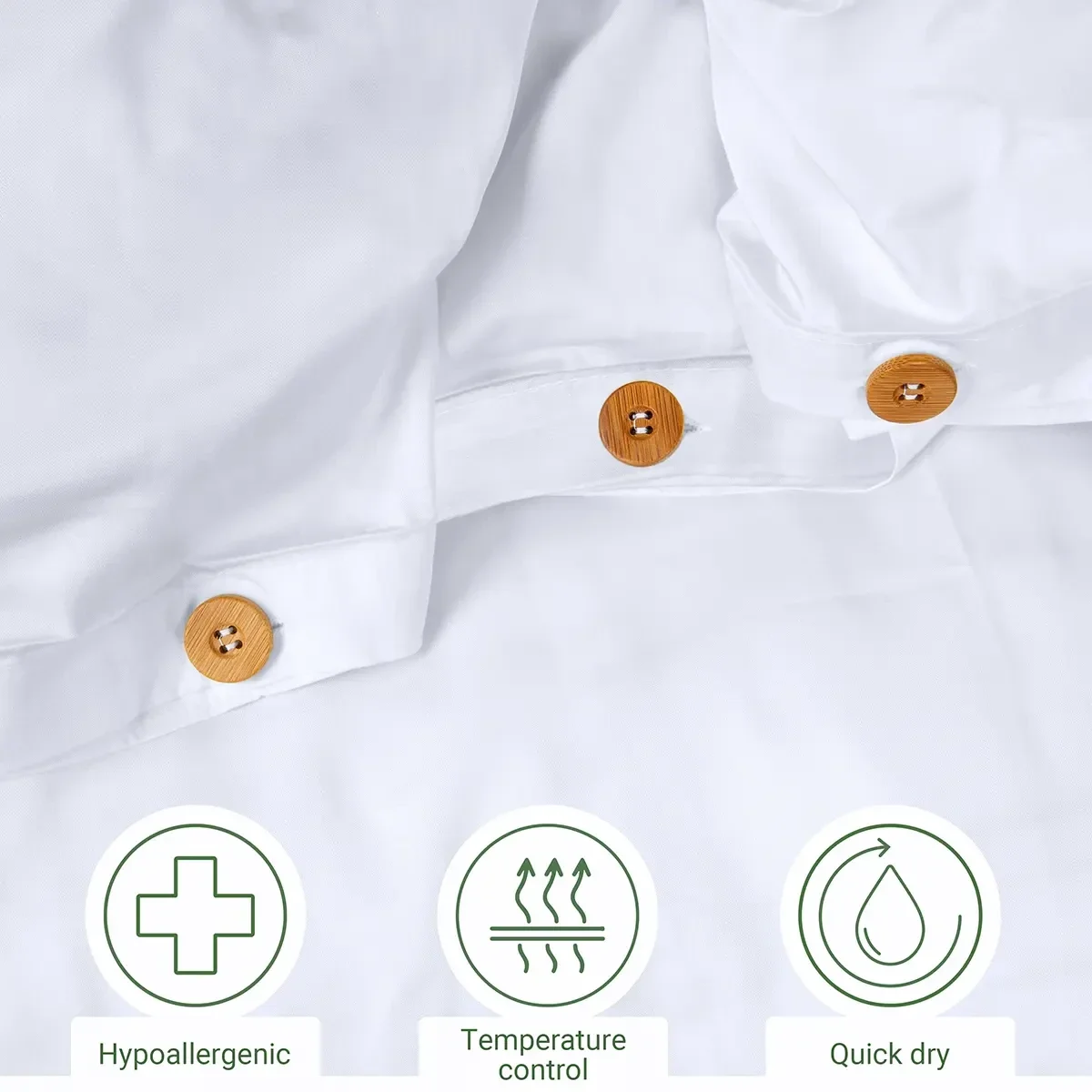The buttons are made of bamboo and our duvet covers are made of bamboo rayon, a natural, durable and renewable resource with a thread count of 300.